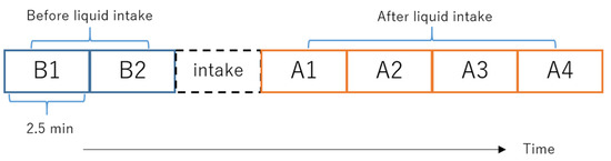 Analysis interval based on a 2.5-min time interval; before liquid intake: B1, B2; after liquid intake: A1, A2, A3, A4.
