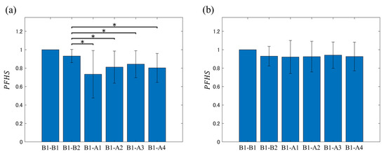 It can be confirmed from Figure 6 that the mean PFHS value was almost unchanged before and after water intake, and no significant change from B1 to B2 was confirmed. Meanwhile, in the before and after carbonated water intake cases, there was variation in the mean PFHS value, but these values tended to be lower after intake compared with those before the intake. Additionally, a significant decrease in PFHS was observed in all analysis intervals in the second half compared with the PFHS of the analysis targets B1–B2.