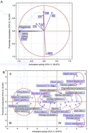 Herbs that proved the highest antioxidant activity include: stinging nettle herb, marjoram herb, cleavers herb, common chamomile flower heads and garlic bulbs. Other raw materials are characterized by a smaller antioxidant activity and a significant differentiation of the basic composition. This is evidenced by the indicated extreme groups, i.e., two-element groups in the first and fourth quarters. The first one includes seeds of black cumin and fruits of milk thistle, whose raw materials were characterized by a low content of NFE, in contrast to the husks of psyllium seeds and black chokeberry fruits, of course, with significantly lower antioxidant activity.