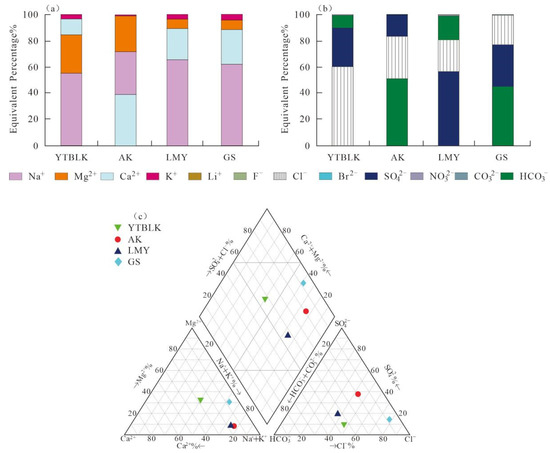 Ion concentration diagrams. (a) Percentage of major cations. (b) Percentage of major anions. (c) Piper diagram of sampling sites in study area.