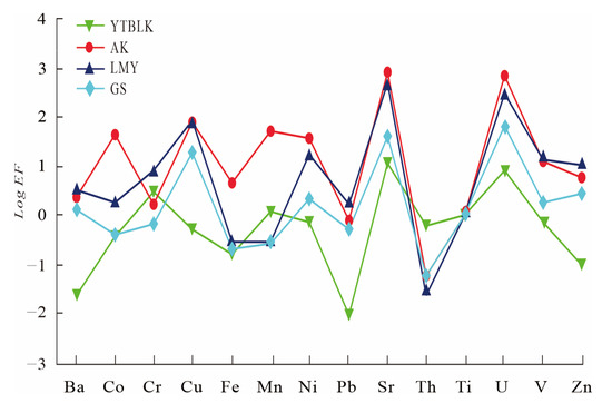 To a certain extent, trace elements in hot springs reflect the degree of water–rock interaction in the groundwater. The presence of 24 trace elements, including Ag, Al, Ba, Be, Cd, Co, Cr, Cu, Fe, Li, Mn, Mo, Ni, Pb, Sb, Se, Sn, Sr, Th, Ti, U, V, Zn, and B, was observed at the four hot spring sampling sites. Table 1 shows the trace element concentrations. The magnitude of trace element enrichment coefficients can be used to determine the source of trace elements in hot spring water, which is calculated as follows: