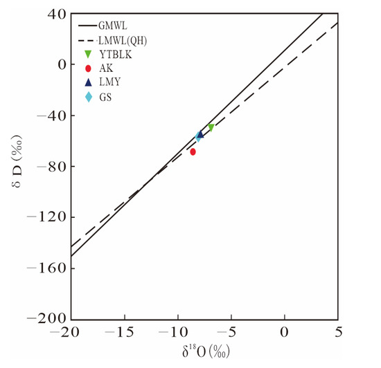 Since altitude varies widely in the Qinghai region, the maximum altitude difference at the sampling site was 633.26 m. Considering that the hydrogen and oxygen isotopes are affected by this altitude variation effect, the altitude effect of isotopes was utilized for the preliminary estimation of the water recharge altitude of the hot springs. The following equation was used:
