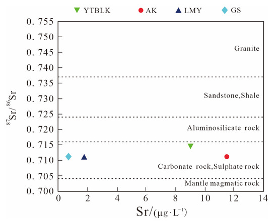 Sulfate, silicate, and carbonate minerals are important sources of Sr in groundwater. The 87Sr/86Sr ratio of the hot spring is often similar to the 87Sr/86Sr ratio of the rock minerals it contacts [56,57]. It is generally accepted that the 87Sr/86Sr ratio for the mantle magma source is 0.70400, the 87Sr/86Sr ratio for the carbonate and sulfate weathering sources is approximately 0.70800, the 87Sr/86Sr ratio for the aluminosilicate weathering sources ranges between 0.71600 and 0.72000, the 87Sr/86Sr ratio for the sandstone and shale weathering sources is 0.72417, and the 87Sr/86Sr ratio for the granite weathering sources is 0.73719 [58]. The relationship between the 87Sr/86Sr ratio and the Sr content of the hot springs in the study region was analyzed. It was revealed that the main weathering sources of the water in these hot springs were carbonate and sulfate (Figure 6). The strontium isotope ratios of the hot springs varied less and remained almost at the same level, while the Sr content varied more. This could be due to the similarity of the surrounding rocks on the flow path and the different accumulation times [59].