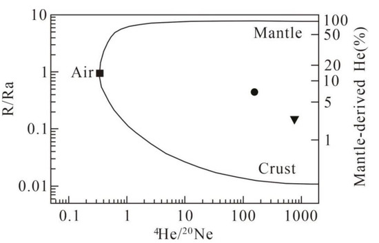 In Equation (7), R denotes the 3He/4He value of the sample, Ra denotes the atmospheric 3He/4He, which is equal to 1.39 × 10−6, (4He/20Ne)V denotes the 4He/20Ne value of the sample, and (4He/20Ne)a denotes the atmospheric 4He/20Ne, which is equal to 0.318. The RC values obtained for the gas samples from the YTBLK and AK hot springs were 0.1496 Ra and 0.4389 Ra. Both values were less than 1 Ra, indicating the characteristics of upper crustal-sourced helium. The 3He/4He gas ratios in the Valles Caldera region, New Mexico indicate a deep magmatic source (R/Ra up to 6) [71]. The 3He/4He ratios of the hot springs in this study area are 2.085 and 6.116, and the values of the AK springs are close to those of Valles Caldera region. After excluding atmospheric helium interference, it was observed that Rc/Ra > 0.1, which suggested that mantle-sourced helium additions occur in the hot springs of the present study region [72,73]. Since the 4He/20Ne-R/Ra relationships of the mantle, crust, and atmosphere are relatively fixed, a 4He/20Ne-R/Ra diagram may be employed to visually and effectively discern the genesis and the source regions of the fluids and rare gas. 3He/4He = 1.39 × 10−6, 4He/20Ne = 0.318 in the atmosphere; 3He/4He = 12 × 10−6, 4He/20Ne = 100,000 in the mantle; 3He/4He = 0. 02 × 10−6, 4He/20Ne = 100,000 in the continental crust. The area between the two black lines represents the mixing of atmospheric, crustal, and mantle helium [74]. The percentage of mantle-sourced helium could then be calculated by casting the hot spring gas data into the 4He/20Ne-R/Ra relationship diagram. The release of the mantle-sourced helium from the YTBLK spring was 3.06%, and that from the AK spring was 7.38% (Figure 7). These results suggested an intrusion of mantle-sourced material in the study region. Large amounts of mantle-derived helium are evident in volcanic regions [75]. However, no active Cenozoic volcanoes have been located in the vicinity of the study region, which suggests that the mantle-derived helium in the study region did not have a volcanic release. The Altun Tagh fault and the East Kunlun fault belt serve as good channels for the upward transport of mantle-derived helium, with dilution of the mantle-source helium via upper crustal-source helium during the upward transport, and this phenomenon is also observed in the Xianshuihe fault [38].