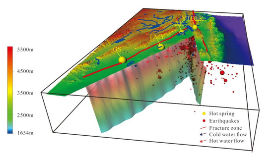 In Equation (2), H denotes the elevation of the recharge region, h denotes the elevation of the sampling point, δG is the δ18O (δD) value of carbonate springs, δP is the δ18O (δD) value of atmospheric precipitation close to the sampling point, and k is the height gradient of the δ18O (δD) value of atmospheric precipitation (‰/100 m). The global average δ18O elevation gradient (k (δ18O) = −0.25‰/100 m) was used as the elevation gradient of the δ18O (δD) values of atmospheric precipitation. The isotopically weighted average of atmospheric precipitation in Qinghai (δ18O = −7.19) was used as the δ18O value of atmospheric precipitation [51]. The recharge elevation of the hot springs in the study region was calculated using Equation (2). The results revealed that the recharge elevations for the YTBLK, AK, LMY, and GS springs were 3535 m, 3676 m, 3477 m, and 3390 m, respectively, among which the recharge elevation of the AK spring was relatively high (Table 3). Tyc et al. discovered a clear spatial correlation between hot springs and active fractures in the western Peruvian Cordillera, and that the tectonics provide pathways for hydrothermal solutions and gases that contribute to the heating of atmospheric water. Therefore, tectonic features play a significant role in the formation of hot spring water [52]. When combined with the topography and geomorphology of the study region, it was determined that the hot spring recharge in the study region was primarily caused by southern Alpine glacial meltwater and tectonic fractures.