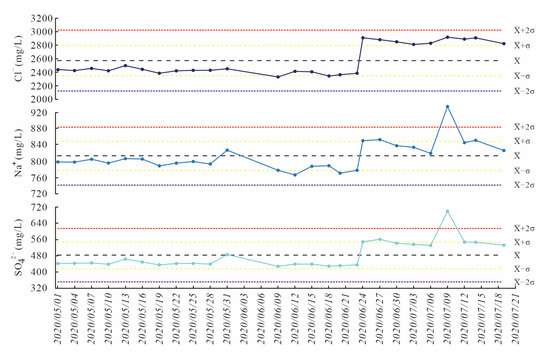 An MS5.5 earthquake occurred in the study region on 19 October 2022, close to the East Kunlun fault belt and spatially positioned 150 km southeast of the AK spring. Since May 2022, the project team has been conducting continuous measurements of the water chemistry ions at AK springs to continuously observe and collect data for the analysis of seismic efficiency. Water testing samples are collected at sampling points every 3 days and subjected to water chemistry measurements and mean-variance calculations. Any information pertaining to observed anomalies is documented. An anomaly is defined as a change in amplitude greater than ±2 times the mean variance. A positive high anomaly is defined as an increase in ion concentration that exceeds +2 times the mean-variance value. In contrast, a negative high anomaly is defined as a decrease that exceeds −2 times the mean-variance value. The negative ion concentration anomaly could be attributed to a relative increase in local atmospheric precipitation recharge and a relative decrease in fluids from deeper sources. The vast majority of seismic-fluid geochemical anomalies occur 3 months before and after an earthquake. These anomalies occur within a narrow range of distance, typically between 20 and 300 km from the epicenter [104]. The data processing results revealed that anomalies in Cl−, Na+, and SO42− ion concentrations occurred in the AK spring at the end of June 2022 (Figure 11). Positive anomalies of varying degrees in the ion concentrations occurred in the study region, possibly related to the MS5.5 (37.69 °N, 92.30 °E) earthquake that occurred on 19 October 2022. In the seismic gestation process, the deep fluid is transported upward along the fissure, and the water–rock interaction rate increases, causing the fluids containing Cl−, Na+, and SO42− at depth to be mixed with shallow fluids, resulting in varying degrees of change in the subsurface fluid components. Therefore, changes in the chemical ion concentrations are an evident response to seismic activity and require enhanced monitoring. Moreover, to provide a reliable basis for earthquake prediction, further intensive sampling and analysis of this hot spring in different seasons over a long period are required to exclude the possibility of randomness.