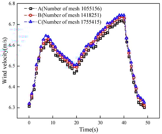 In order to ensure the accuracy of the simulation results, the model mesh is tested for independence. Three different mesh number division schemes of 1055156, 1418251, and 1755415 (A, B, C) were used to simulate the cage operation in the shaft. Figure 3 shows the change of airflow velocity at the outlet of the 1584.0 m transport lane when the wind speed at the entrance of the shaft is 4.4 m/s, and the cage runs at a constant speed of 10.0 m/s for 48.5 s (half cycle). From the figure, we can see that the simulation results of three different meshing schemes have little difference, which satisfies the independence test. Considering the calculation amount and accuracy of the simulation, it is decided to use the B scheme for subsequent simulation analysis.