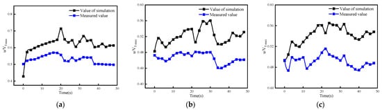 The measured wind speed values and simulated wind speed values of 6 measuring points are dimensionless [,] and compared respectively, and the results are shown in Figure 5. From the figure, we can see that the error of the measuring point closer to the shaft is large, and the error of the measuring point farther away from the shaft is decreasing. After calculation, the average velocity coefficient error between the simulated value and the measured value at each measuring point of a, b, c, d, e and f is 14.40%, 10.36%, 9.06%, 8.07%, 6.29% and 5.75% respectively. The average velocity coefficient error of each measuring point is less than 15.0%, which can verify the accuracy of the model. It shows that it is feasible to use the SST k-ω turbulence model to simulate the change of piston wind with time series and its influence on the air flow of transport lanes.