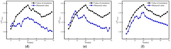 Comparison of simulated and measured piston wind speed: (a) Verify the value point a, (b) Verify the value point b, (c) Verify the value point c, (d) Verify the value point d, (e) Verify the value point e, (f) Verify the value point f.