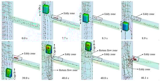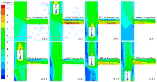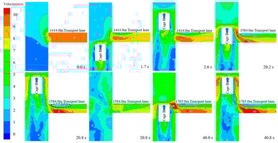 Figure 7 shows the effect of the cage running against the wind on the airflow field of each lane. When the cage does not reach the transport lane before. The cage runs in the shaft, resulting in the increase of shaft blockage ratio and the decrease of effective cross-sectional area. High-speed airflow is generated in the shaft and diverted into each transport lane. At this time, the piston wind in the shaft can promote the air flow in the transport lane and improve the ventilation effect when the cage runs against the wind through each transportation lane. The high-speed piston airflow generated around the cage and the ventilation airflow in the shaft are squeezed and merged into the transport lane at the same time. It will lead to a significant increase in the airflow velocity in the lane, and a high-speed eddy current zone will be formed between the cage and the lane mouth. Under the influence of a high-speed vortex area, the airflow velocity into the transport lane is higher. However, the decrease in ventilation area will lead to a decrease in ventilation volume in lanes when the cage runs against the wind after passing through each transport lane. The large-area low-speed eddy current zone generated at the tail of the cage obviously hinders the airflow in the lane and has a great influence on the ventilation effect in the lane.