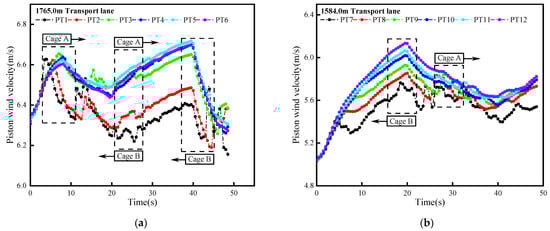 In the 1765.0 m transport lane, the maximum and minimum piston wind speed difference of measuring points PT1-PT6 during the whole operation of the cage is 0.47 m/s, 0.43 m/s, 0.40 m/s, 0.44 m/s, 0.41 m/s and 0.42 m/s, respectively. In the 1584.0 m transportation lane, the piston wind speed difference of the measuring points PT7-PT12 is 0.74 m/s, 0.83 m/s, 0.91 m/s, 0.99 m/s, 1.03 m/s and 1.11 m/s respectively. In the 1414.0 m transport lane, the piston wind speed difference of measuring points PT13-PT18 are 0.85 m/s, 0.69 m/s, 0.57 m/s, 0.48 m/s, 0.46 m/s, 0.47 m/s. The greater the difference in the piston wind speed, the greater the fluctuation of the ventilation volume in the transportation lane, which will seriously affect the air flow transportation in the transportation lane and reduce the ventilation effect.