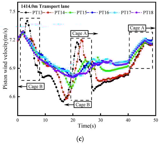 The time-varying curve of piston wind speed at each measuring point in different transport lanes: (a) 1765.0 m transport lane, (b) 1584.0 m transport lane, (c) 1414.0 m transport lane.