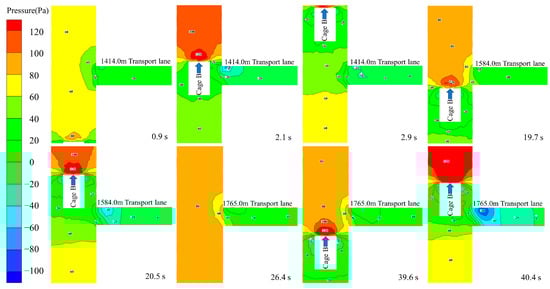Taken together from Figure 10 and Figure 11. Whether the cage is running along the wind or against the wind, the cage operation will cause a sudden increase and a sudden drop in the pressure in the shaft, which has a certain impact on the ventilation effect in the shaft. Moreover, the disturbance of the piston wind generated by the cage running against the wind to the pressure field in the shaft is far greater than the influence of the cage running along the wind. The 1765.0 m transport lane is closest to the shaft inlet, and the initial pressure is larger, so the affected area and degree in the lane are also larger.