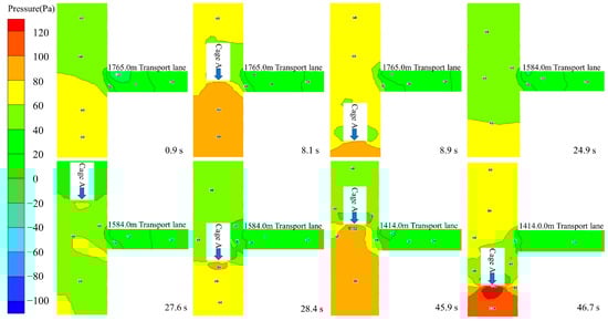 Figure 10 shows the effect of the cage running against the wind on the pressure in each transport lane. Positive pressure is formed in front of the cage, running against the wind, and negative pressure is generated in the rear and on both sides. Therefore, when the cage reaches each transport lane, it will cause a sudden increase in pressure on the line. When the cage passes through, the induced wind pressure at the tail of the cage will cause the pressure in the transportation lane to drop sharply.