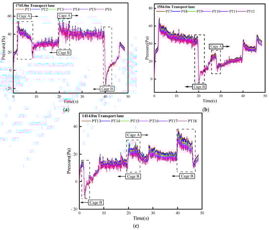 The time-varying curve of pressure at each measuring point in different transport lanes: (a) 1765.0 m transport lane, (b) 1584.0 m transport lane, (c) 1414.0 m transport lane.
