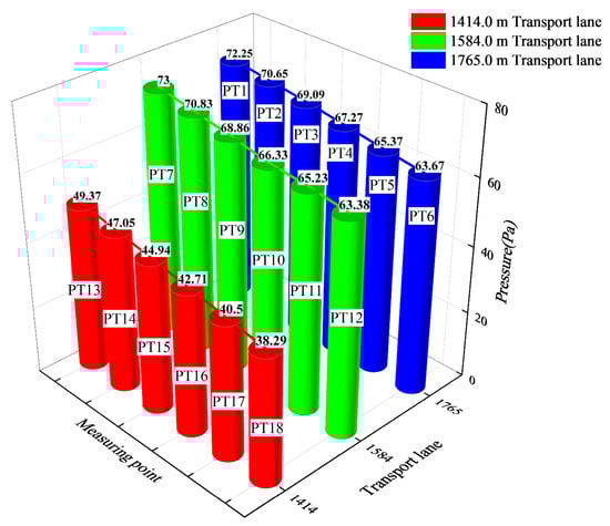 Figure 13 shows the difference between the maximum and minimum pressure caused by the piston effect in each transport lane. From the figure, we can see that the pressure difference of each measuring point is linearly decreasing with the distance from the measuring point to the shaft. That is, the farther away from the shaft measuring point, the less affected by the piston effect, and the smaller the pressure difference. The measuring point distance increased from 21.7 m to 71.7 m, and the pressure in 1414.0 m, 1584.0 m and 1765.0 m transport lanes decreased by 11.08 Pa, 9.62 Pa and 8.58 Pa, respectively.