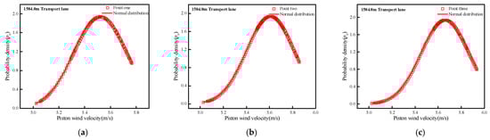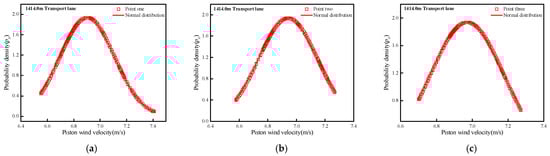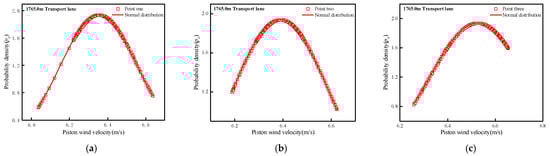The airflow in the transport lane belongs to turbulent flow. Under the influence of piston wind, the airflow particles collide, mix and exchange with each other. Turbulence is a random motion process that changes irregularly in time, but it has a regular probability distribution. Therefore, this paper uses probability density distribution to analyze the statistical characteristics of the piston air flow in each transport lane []. Three feature points with different distances from the entrance of the lane were selected along the central axis of the three transport lanes of 1765.0 m, 1584.0 m and 1414.0 m, respectively, for wind speed probability density statistics, and they were compared with the probability density distribution of normal distribution function by Formula (3). The results are shown in Figure 14, Figure 15 and Figure 16.