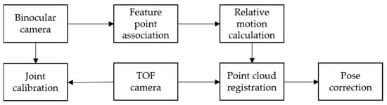 A schematic diagram of the composite pose measurement system built in this paper is shown in Figure 2. The visual image is acquired by grayscale cameras, and the point cloud data are acquired by a TOF camera. The projection points of the space points in the world coordinate system on the left and right camera imaging planes can be expressed as and , respectively. The left and right camera coordinate systems are and , respectively. The TOF camera coordinate system is .