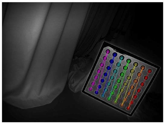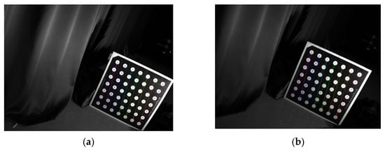 The feasibility of a circular calibration board was verified in our previous work [24]. The circular calibration board is used to replace the traditional checkerboard calibration board. The center coordinates of the circle can be accurately extracted from the image. The circular calibration board is moved to different positions to acquire images that fill the entire camera field of view. Figure 4 shows the extraction results of the circular marker points on the left and right camera calibration boards.