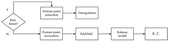 - For a non-first frame, the number of feature points will decrease if the optical flow tracking time is too long. If the number of feature points tracked in the current frame is less than threshold (since perspective-n-point problems require at least 3 sets of points, the threshold should be greater than 3, which was set as 6 in this manuscript), then this frame adopts the method of the first frame to add new feature points. After obtaining the 3D set in the left camera coordinate system of the previous frame and the 2D feature point set of the left image in this frame, the rotation matrix and translation vector are solved quickly based on the random sample consensus (RANSAC) [27] method.