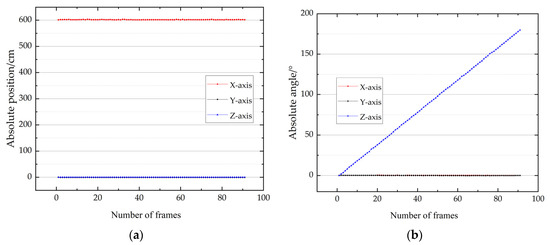 The target rotated 180 degrees around the rolling axis in this simulation experiment. A total of 90 frames were collected. The angles of the X-, Y, and Z-axis are described as the yaw, pitch, and roll angle below, respectively. Figure 11a,b present the X-, Y-, and Z-axis position and Euler angle curve results during the low-speed rotation process.