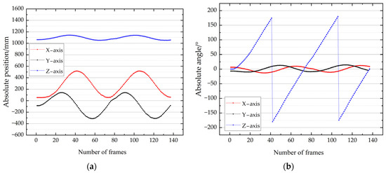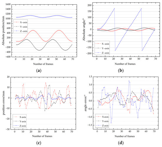 It can be concluded that the absolute transformation also represents the position error curve. The maximum error of the X-, Y-, and Z-axis positions was 0.27, 0.88, and 1.94 mm. There is no doubt that the trend of the roll angle motion was consistent with the actual situation. The maximum error of the X-, Y-, and Z-axis angles was 0.32°, 0.31°, and 0.56°.
