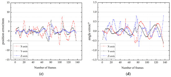 The kinetic data are consistent with those in Section Rotation Experiment at Low Speed. The experimental conditions were set at a relatively high-speed rotation (approximately 12 degrees per frame). Figure 17a,b show the X-, Y-, and Z-axis position and Euler angle curve results during the high-speed rotation process. Figure 17c,d illustrate the X-, Y-, and Z-axis position and Euler angle error results during the rotation process.
