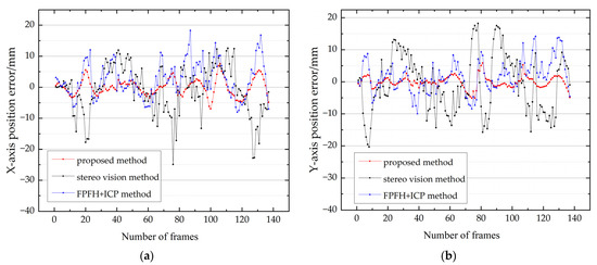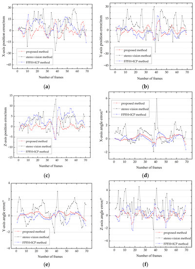 Figure 16 illustrates the X, Y, and Z three-axis position and Euler angle error results obtained by the proposed method, the stereo vision method, the traditional fast point feature histograms (FPFH) [31], and the ICP algorithm throughout the low-speed process.