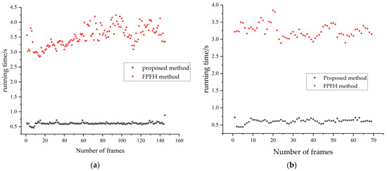 Comparison of the computational time between the proposed method and the FPFH method in rotation experiments: (a) low-speed experiment; (b) high-speed experiment.