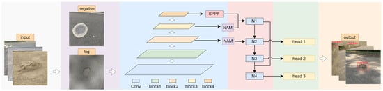 As shown in Figure 2, the pothole detection method designed in this paper involves data augmentation and network model training. First of all, data augmentation is carried out for the input pothole dataset. The data augmentation methods mainly include taking a manhole similar to the pothole as a negative sample and adding fog to simulate the real environment. Secondly, we select the mature network model YOLOv5 one-stage detection model as the baseline model for improvement. It mainly includes three parts: backbone, neck, and head. In the backbone part, we use GhostConv to replace the conventional convolution and the designed LF module to replace the feature extraction module, improving the cspdarknet53 [47] structure used by YOLOv5. In the neck part, we also use the PANet structure. Similar to backbone, we use GhostConv, the designed LF module, and the NAM attention module. In the head part, the same as the YOLOv5 network model, we use the anchor-based detection head, that is, YOLO head. We use three detection heads, which can meet the actual requirements of detecting potholes of different sizes.
