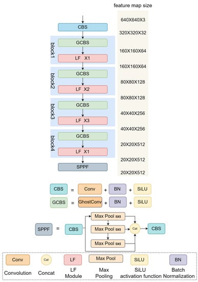 As shown in Figure 3, the backbone mainly includes five feature extraction modules and an SPPF (Spatial Pyramid Pooling—Fast) module. The first feature extraction module, CBS, is composed of Conv, Batch Normalization, and SiLU activation function. The remaining four feature extraction modules are composed of GCBS and LF modules designed by us. Unlike CBS, GCBS consists of GhostConv, Batch Normalization, and SiLU activation function. The difference between the four feature extraction modules is that block1, block2, block3, and block4 contain 1, 2, 3, and 1 LF modules, respectively, which can achieve different levels of feature extraction for feature maps of different sizes.