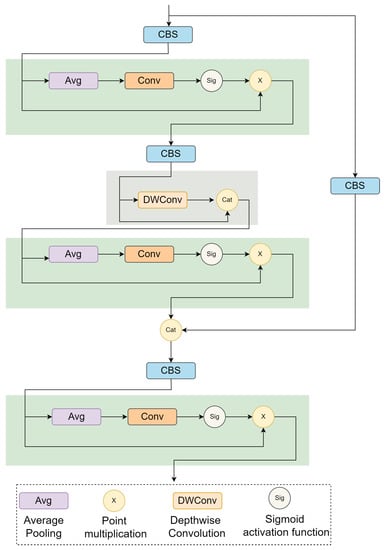 where x is the input feature map, is a convolution operation, is Batch Normalization, is SiLU activate function, is the CBS module, indicates the global average pooling operation, is sigmoid activate function, · is point multiplication operation, is an ECA module, is the output feature map before lightweight and is the output feature map after lightweight, is a depthwise separable convolution, is concat operation, y is the output feature map.
