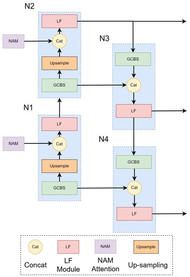 As shown in Figure 5, the neck uses the PANet structure, conducts top-down feature fusion, and then conducts bottom-up feature fusion. The neck part mainly includes the NAM attention module [49] and four feature fusion modules. Similarly, in order to ensure the lightweight and detection accuracy of the entire network model and meet the real-time and accuracy requirements of hole detection, we used the GCBS module and LF module in each feature fusion module.