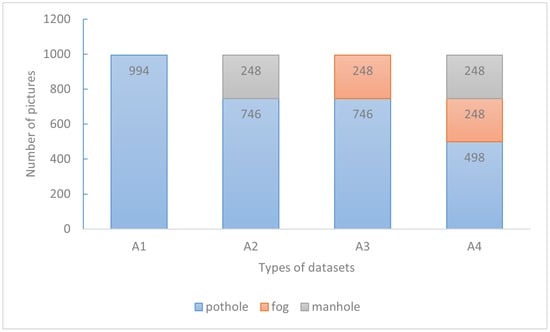 - The fogging dataset, referred to as A3 in Table 1, includes 746 pictures of potholes under normal conditions in the baseline dataset A1 and 248 pictures of potholes after the fogging treatment. The training set includes 795 pictures, and the test set contains 199 pictures. The ratio of the training set to the test set is 8:2.