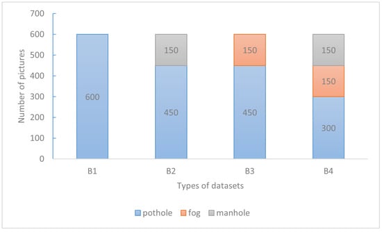 Number of photos of each type in B1, B2, B3, B4 of pothole600 dataset.