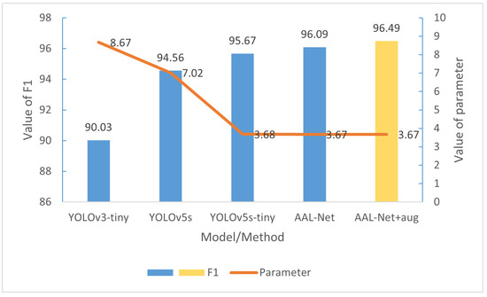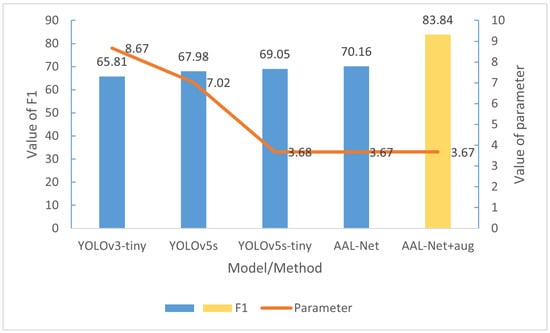 In the self-made dataset, the comparison between F1 values and parameter values of different methods, the horizontal axis represents different methods, the left half of the vertical axis represents F1 values, and the right half of the vertical axis represents parameter values.