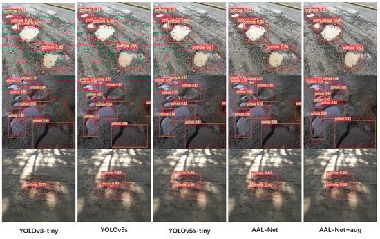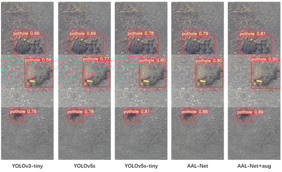 Similarly, as shown in Table 4, in the pothole600 dataset, the F1 values of AAL-Net are 6.06%, 1.53%, and 0.42% higher than those of the YOLOv3-tiny, YOLOv5s, and YOLOv5s-tiny models, respectively. With our data augmentation method, the F1 value of the AAL-Net is increased by 0.4%. The experimental results (Figure 12) and the actual effects (Figure 13) are visualized.