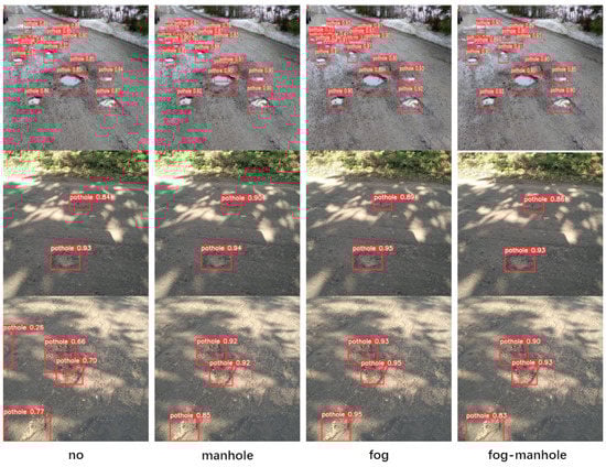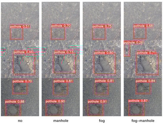 As shown in Table 6, in the pothole600 dataset, the F1 values are increased by 2.29%, 2.29%, and 0.25%, respectively, after the negative samples, fogging, and mixed data augmentation methods. The actual effects (Figure 15) are visualized.