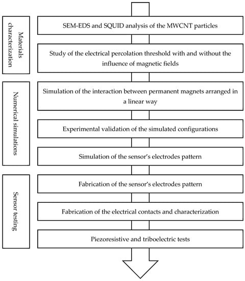 The workflow adopted in this work is shown in Figure 1, covering three main topics: the characterisation of the MWCNT and its nanocomposites, numerical simulations of the magnetic interactions, and sensor fabrication and testing. The characterisation of the MWCNT and its nanocomposites focused on the study of the MWCNT’s magnetic properties and the influence of the application of magnetic fields upon the electrical percolation threshold of MWCNT/PDMS nanocomposites prepared at different concentrations. Then, the numerical simulations helped to select the best magnet configurations to create linear patterns. The evaluation of the interactions between individual magnets allowed the simulation of more complex sensor electrode patterns. Linear and zig-zag patterns were simulated; however other designs may be simulated according to the application requirements. Finally, the performance of the fabricated sensors was evaluated both as a piezoresistive sensor to detect deformation and as a triboelectric sensor to detect contact and release.
