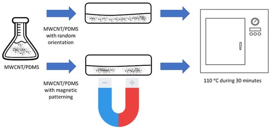 The fabrication process of all the MWCNT/PDMS nanocomposites is schematically illustrated in Figure 2. First, the MWCNTs were dispersed into the PDMS under constant manual stirring for 2 min. Then, the curing agent, in a 1:10 ratio, was added to the MWCNT/PDMS mixture and manually stirred for another 2 min. Then, the mixtures obtained were placed in rectangular laser-cut acrylic moulds, on top of the magnetic patterns, for 15 h. The samples were cured during the 15 h to make sure that the PDMS was solid enough to prevent the movement of the MWCNTs before the final curing process. The final curing process was done in an oven at 110 °C for 30 min without magnetic fields. If the curing process is too fast, there is not enough time for the particles to settle in the right position, affecting the patterning quality.
