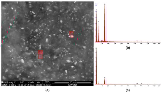 Detection of particles based on aluminium and iron as some of the impurities of the CCVD fabrication process of the MWCNT NC 7000. (a) SEM image and regions where the SEM/EDS was performed. (b) regions with higher amounts of aluminium oxide impurities, and (c) regions with lower impurities.
