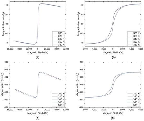 By analysing Figure 5b in detail, it is possible to notice a dominant ferromagnetic effect []. The measured coercivity (Hc), retentivity (Mr), and saturation magnetisation (Ms) of the MWCNT particles at 300 K were 84.81 Oe, 0.13 emu/g, and 1.07 emu/g, respectively. The results demonstrate that the magnetic properties of the MWCNTs are invariant in the temperature range studied, from 300 to 380 K.