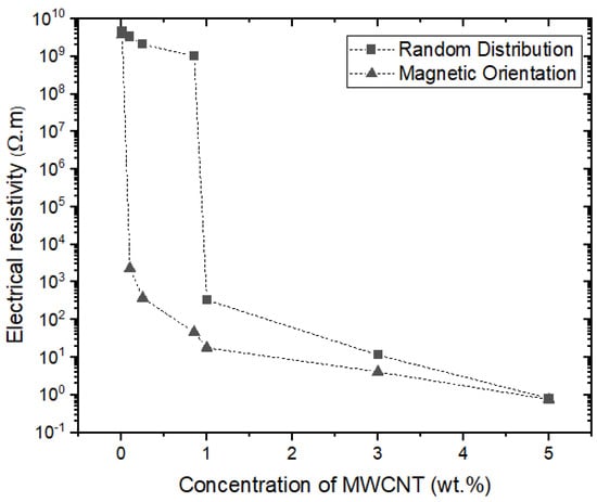 The nanocomposites’ electrical resistivity, prepared with the magnetic field (magnetic orientation) and without magnetic field (random distribution), is presented in Figure 6, defining the electrical percolation threshold obtained in each case.