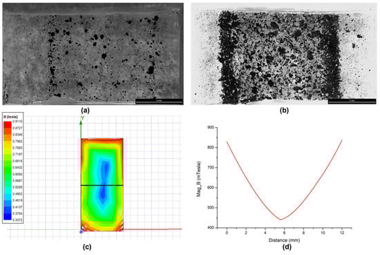 Figure 6 depicts the impact of the magnetic field’s application on the nanocomposites’ electrical resistance. The magnetic field application reduces the MWCNT concentration at the electrical percolation threshold from 0.85–1 wt.% to 0.01–0.1 wt.% MWCNT. The longitudinal images of the nanocomposites obtained by digital microscopy show the effect of the magnetic field on the nanocomposite morphology, as illustrated in Figure 7a,b. The magnetic field forces the localisation of the nanoparticles near the magnet, increasing the contact between conductive particles. A numerical simulation was performed to predict the localisation of the MWCNTs relative to the magnet. The simulation was performed using ANSYS Maxwell software to illustrate the effect of the magnetic field on two stacked permanent magnets. Figure 7c,d show that magnetic flux density is predicted to be greater at the magnet’s edges.