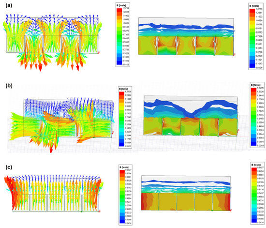 To propose low electrical percolation threshold designs for the fabrication of sensors, MWCNT interaction with more than one magnet was simulated. Three different configurations of permanent magnets were studied. The first pattern consisted of the use of permanent magnets in an alternating configuration; the second pattern consisted of a Halbach array; and finally, the third pattern consisted of the utilisation of permanent magnets in a design where the surface of the magnets had the same polarity. The configurations were first simulated using ANSYS software and then replicated in the laboratory. The magnets were placed under MWCNT/PDMS nanocomposites with a concentration of 0.1 wt.% before the cure of the polymer. Figure 8 represents the simulation results for the magnetic field distribution and the magnetic flux lines for the three different configurations.