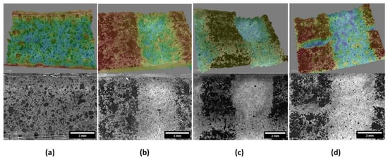 Figure 9 shows the magnetic patterns achieved using the three magnetic configurations (Figure 8a–c), compared with a randomly distributed nanocomposite (Figure 9a). The top line of Figure 9 represents the 3D image obtained in the micrographs, while the bottom line shows optical micrographs of the nanocomposites prepared. The 3D images reinforce the location of the MWCNT agglomerates on the polymeric matrix. A comparison of the simulation and experimental results shows the similarity between the MWCNT location and the simulation predictions, the latter showing the density of the magnetic field of permanent neodymium magnets in the air.