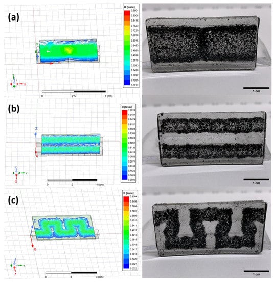 Magnetic patterns in Ansys Maxwell and magnetic patterns of MWCNT/PDMS achieved in the laboratory, (a) Rectangular; (b) Parallel lines; and (c) Zig zag shape.