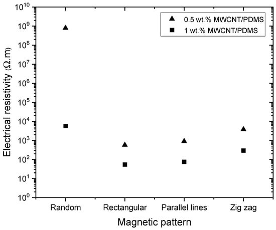 Figure 10 illustrates that, as demonstrated before, the pattern generated by the simulation for the magnetic field intensity is replicated by the MWCNT localisation inside the PDMS matrix. While analysing the electrical resistivity of the nanocomposites prepared with different magnetic patterning, shown in Figure 11, it is observed that the random distribution nanocomposite with 0.5 wt.% MWCNTs has a high electrical resistivity due to a lack of contact between conductive particles. The nanocomposites prepared with magnetic patterning presented lower electrical resistivity compared with randomly distributed nanocomposites, either for 0.5 or 1 wt.% MWCNT concentration. The zig-zag pattern produced higher electrical resistivity nanocomposites than the other patterns, probably due to the increase in length of the electrically conductive path. This increase in resistivity may help to adjust the electrical resistance of a sensor if needed.