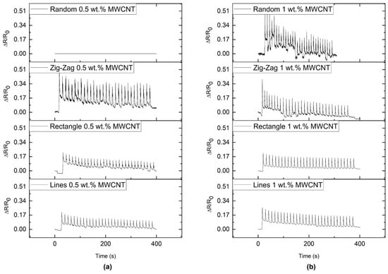 All the samples were tested during 30 cycles of 3-point bending to evaluate the piezoresistive effect,. The piezoresistive effect was measured for 0.5 and 1 wt.% concentrations of MWCNTs, all the magnetic patterns, and random distribution nanocomposites. Figure 12 shows that the nanocomposites with a random distribution for 0.5 wt.% of MWCNTs did not present a piezoresistive response due to their high electrical resistance. Conversely, all the nanocomposites prepared with magnetic patterning presented a piezoresistive response. It was observed that, for an MWCNT concentration of 1 wt.%, the random distribution provides a more unstable response than the magnetically patterned nanocomposites. After analysis of the piezoelectric response obtained for all the magnetically-induced patterns, the parallel line pattern was selected for dynamic tests.