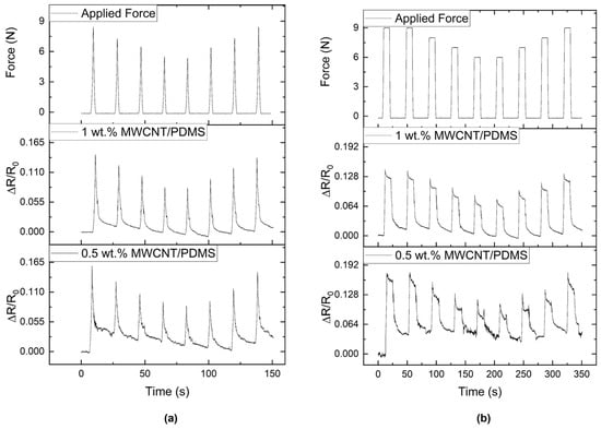 As shown in Figure 13, both concentrations are adequate to develop piezoresistive sensors and offer good stability under the application of decreasing and increasing forces. The nanocomposites respond when the force is applied instantaneously, as well as when it is maintained for 10 s before release. The samples show good stability since the electrical resistance is similar during the application of decreasing and increasing force. In the future, a deeper analysis of the sensor performance can be carried out, including the evaluation of the use of pre-strain since the first deformation appears to have a different response compared to the deformations that follow.